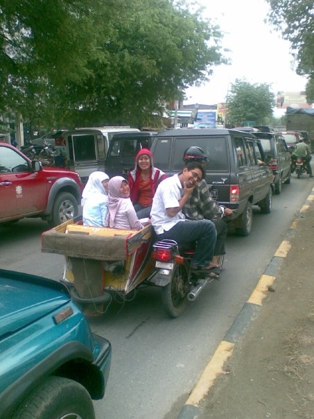 Dulu aku waktu masih tinggal di mess yang lama, yang cukup jauh dari pusat kota, aku punya becak langganan. Namanya Bang Imron. Becaknya keren, dengan motor Honda Tiger keluaran terbaru yang semua body-nya dicat biru tua sehingga menimbulkan kesan macho. Si abang-nya pun sangat ramah. Meski hampir semua keluarganya sudah hilang sebagai korban tsunami, garis-garis kesedihan di wajahnya seperti sudah tergantikan dengan semangat juang melayani penumpang (baca: customer) sebaik-baiknya. Bang Imron yang lumayan ganteng ini pun siap dipanggil ke rumah kapan pun. Tinggal sms, tunggu tidak lebih dari 15 menit, ia sudah siap mengantar kemanapun kita mau. Ke pasar, ke kantor bahkan pernah sampai ke Pelabuhan Laut yang lumayan jauh untuk menumpang becak, si abang siap sedia. Itu pun sebelumnya masih pake acara jemput jemput teman dulu. Jatah penumpang yang sebenernya hanya berdua bisa jadi bertiga bahkan berempat yang jadi berlima sama abangnya. Ketika Mama kesini setahun yang lalu, Bang Imron pulalah yang mengantar kemana-mana. Mengingat aku sendiri tidak punya banyak waktu untuk menemani Mama kemana-mana. Hebatnya lagi, ia sama sekali tidak pernah mematok tarif. Padahal naik becak di Aceh terkenal mahal jika dibandingkan dengan daerah-daerah lain yang juga menggunakan kendaraan umum jenis ini. Di Medan misalnya, dengan jarak tempuh yang sama bisa lebih murah hingga 60% dibandingkan di Aceh. Karena pelayanan Bang Imron yang memuaskan ini, aku tidak segan-segan merekomendasikan jasanya ke teman-teman. Hasilnya, semua bermerasa senang atas service yang diberikan si abang.